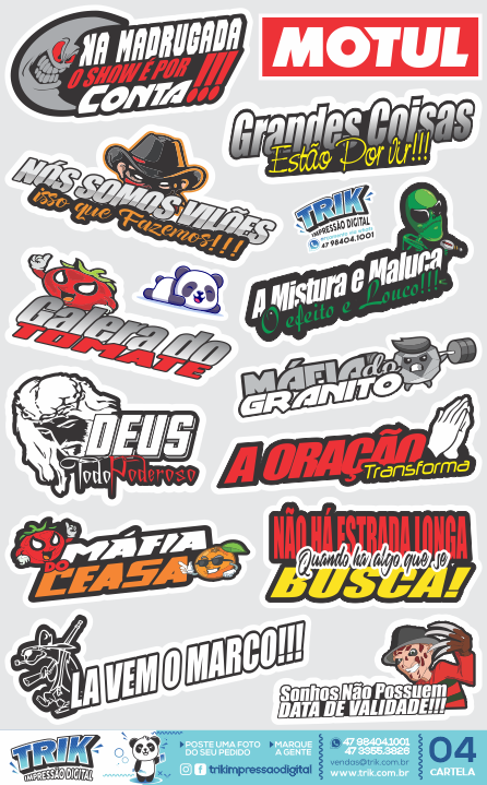 Cartela de adesivos Personalizados para Carro, Moto, Bike, Caminhão, Trator
